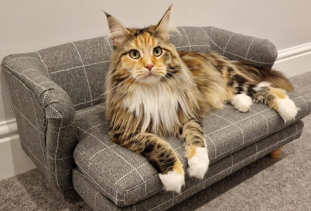 Grand Champion Tigerfeet Chianti (or Cheeky as she is known to us day to day in our home) is our stunning Torbie Queen, and we were entrusted with her by Catherine Lavell of Tigerfeet Maine Coons in 2022, and we’re so truly grateful as she is a stunning one of a kind girl.